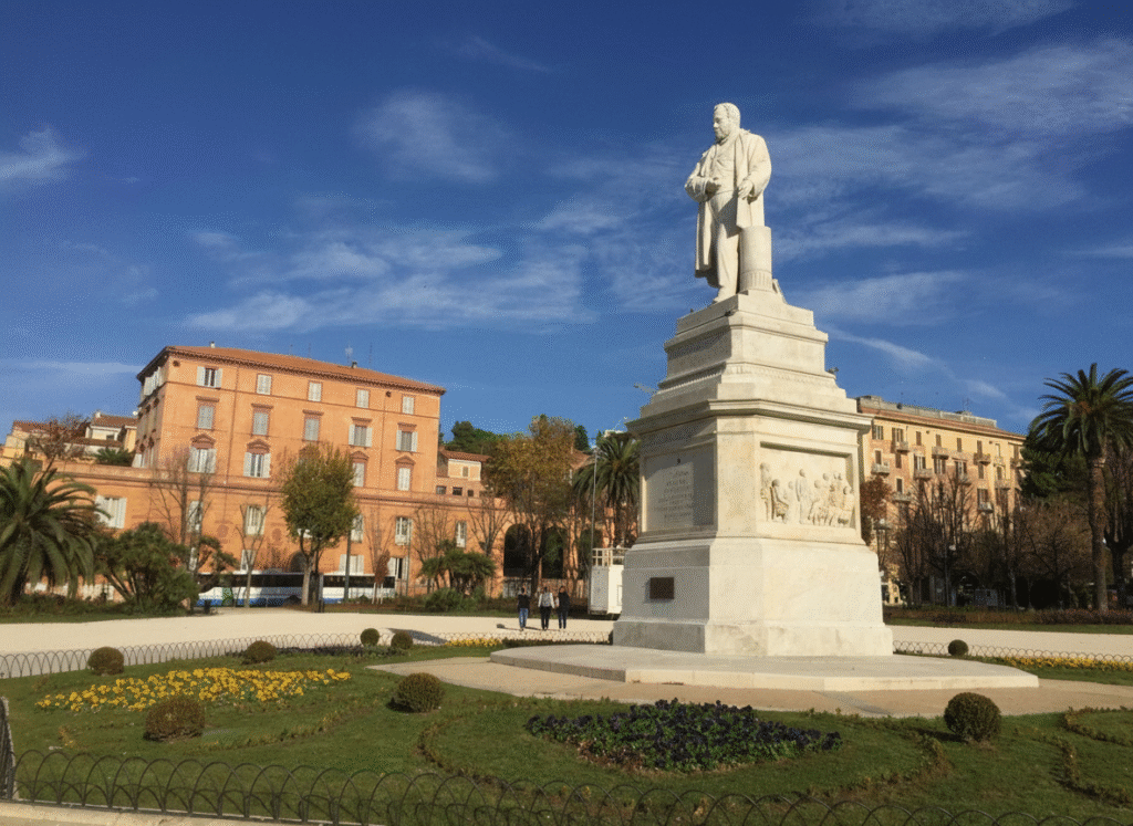 The statue shows Cavour standing, with reliefs on the base recalling key moments of his political career, in the middle of one of Ancona’s main tree-lined squares.