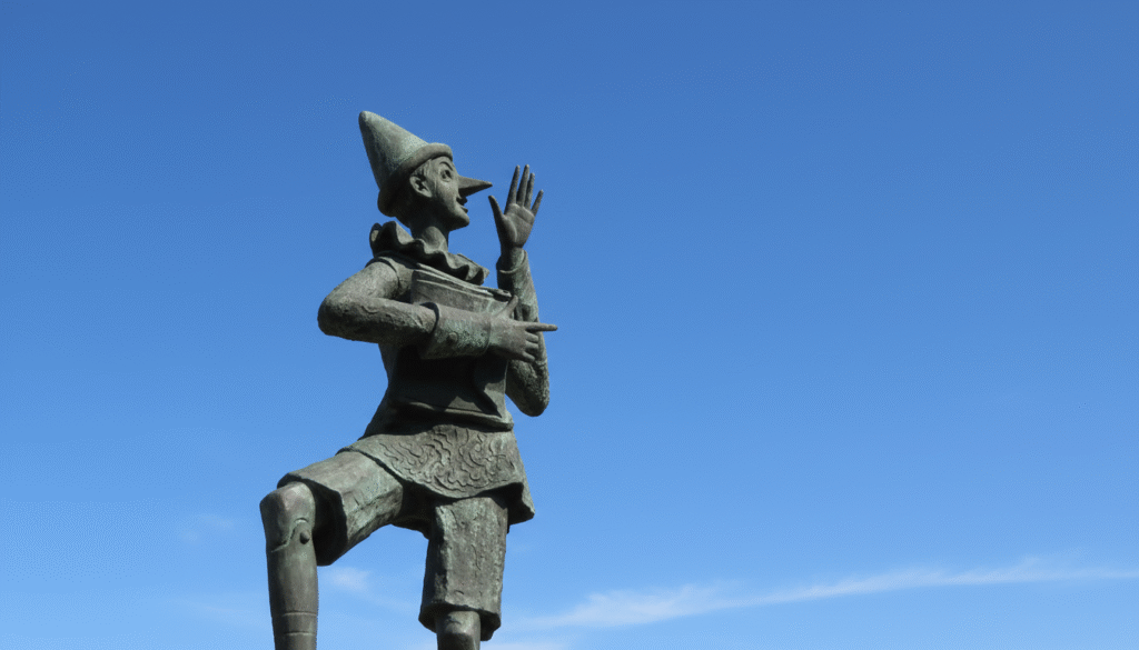 The bronze statue shows Pinocchio with his school satchel, standing on a book-shaped base with inscriptions, and it has become a beloved place for children and locals of all ages.
