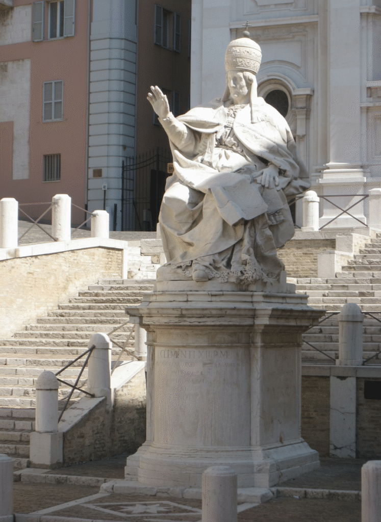 Carved in marble by Agostino Cornacchini in the 18th century, it celebrates the pope who supported major works on Ancona’s harbour and urban layout, becoming a symbol of the city’s bond with the Papal States.