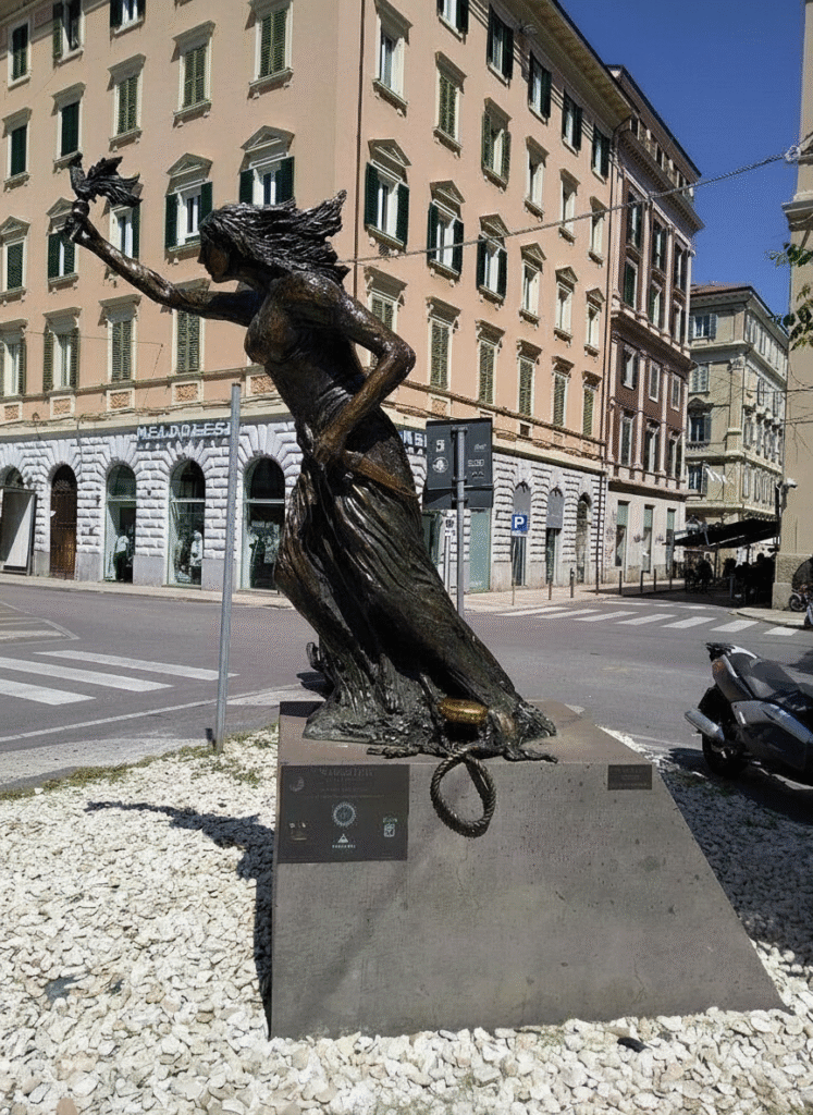 It represents Stamira, a 12th-century heroine of Ancona who, according to tradition, sacrificed her life to set fire to enemy siege engines, and today she is remembered as a symbol of courage and freedom.